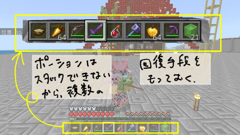 ピンチの時に使うポーションやブロック、武器の並び順を整えておこう。各自使いやすい並びがあると思うので、ここは各々の好き好きとなる。