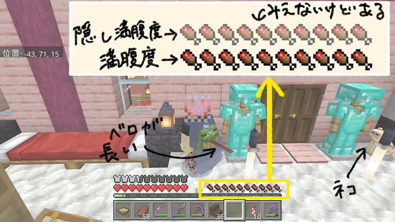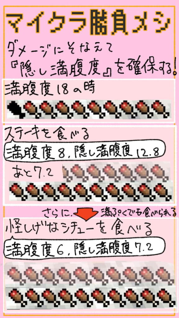 マイクラではダメージを受けるとハートが減ってしまうが、満腹度を消費することで自動的に回復される。満腹度は「目に見える満腹度」が20(お肉10個分)、更に目に見えない「隠し満腹度」というのが20(お肉10個分)ある。ダメージの回復には、「隠し満腹度」から先に使われる。隠し満腹度は、普通の満腹度が回復したときの総量までしか回復しない。